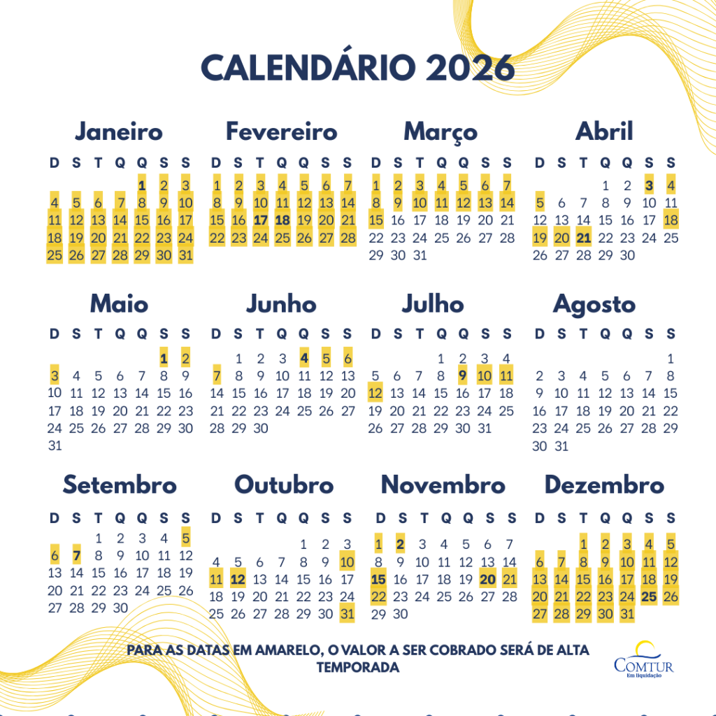 Para fins de aplicação da Taxa de Controle e Fiscalização, consideram-se como períodos de alta temporada e feriados prolongados, para o exercício de 2025, as seguintes datas (ver calendário):