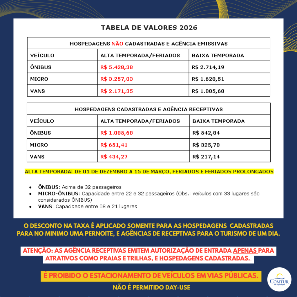 Alta Temporada (1º de dezembro a 15 de março, além de feriados e feriados prolongados estaduais e federais) serão cobrados: